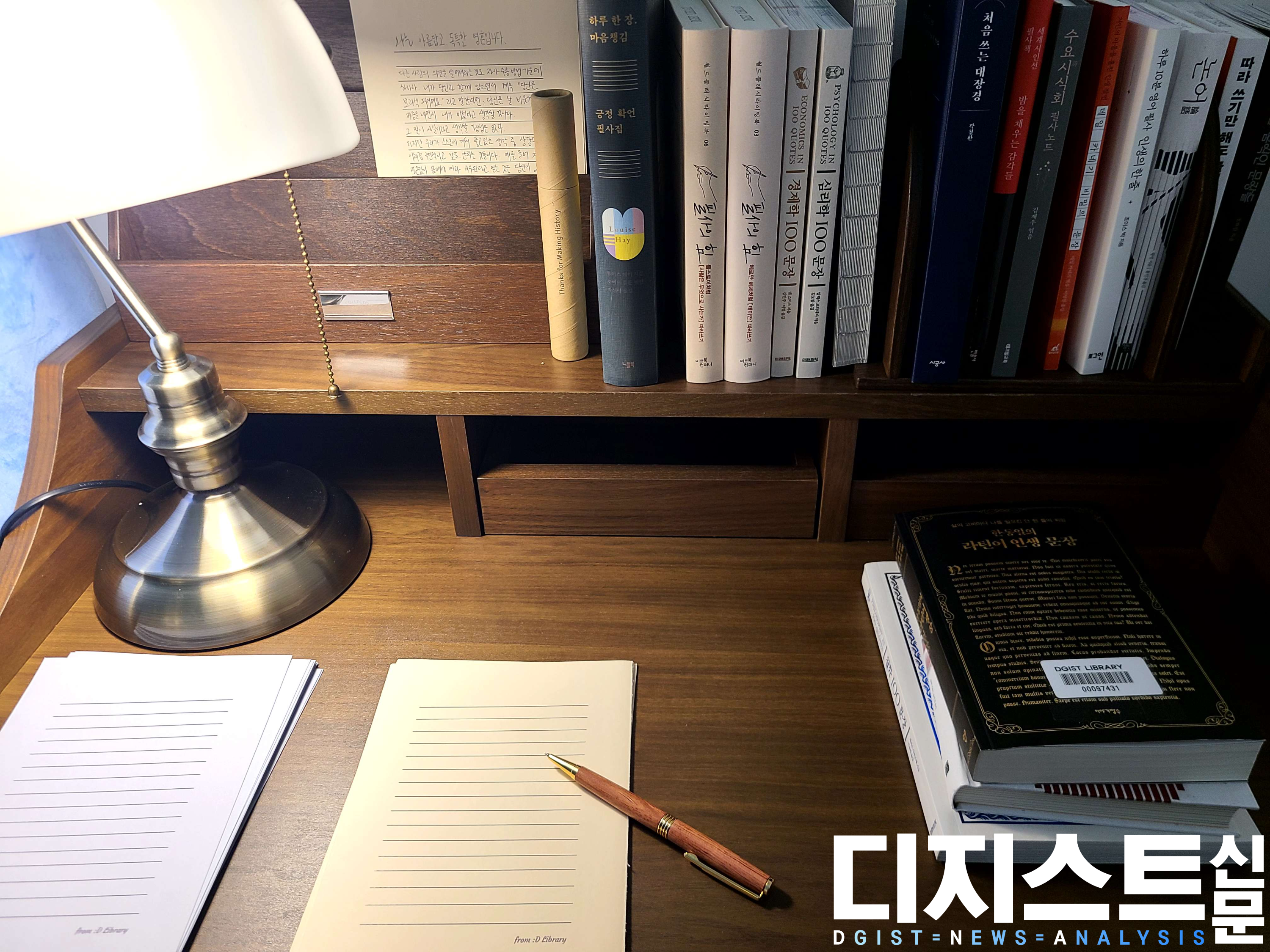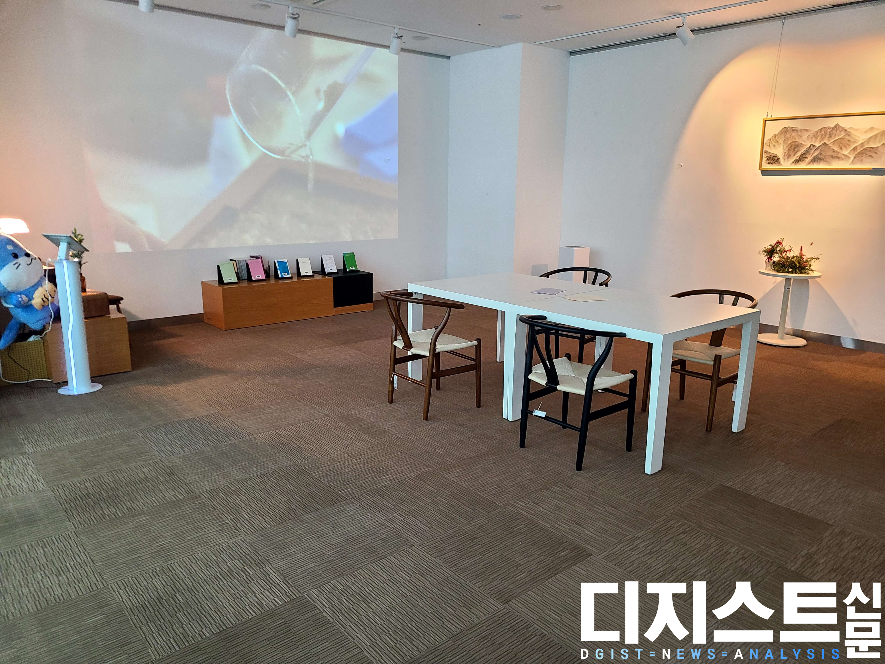 봄을 맞이하여 DGIST 학술정보관 갤러리에도 변화가 찾아왔다. 갤러리 한쪽엔 필사 관련 책과 필사 종이가 있는 책상이 마련되었고, 귀여운 달구를 보며 마음의 드는 구절을 필사할 수 있다. 지난 2월 퇴임한 국양 전 총장이 그린 비슬산 작품 또한 감상할 수 있다. 왼쪽 벽면에는 작년에 열린 기록 워크숍, 「나에게 보내는 2023년의 기록」의 영상이 상영중이다.