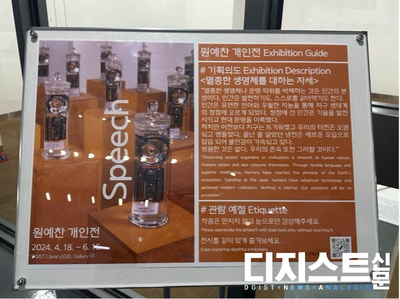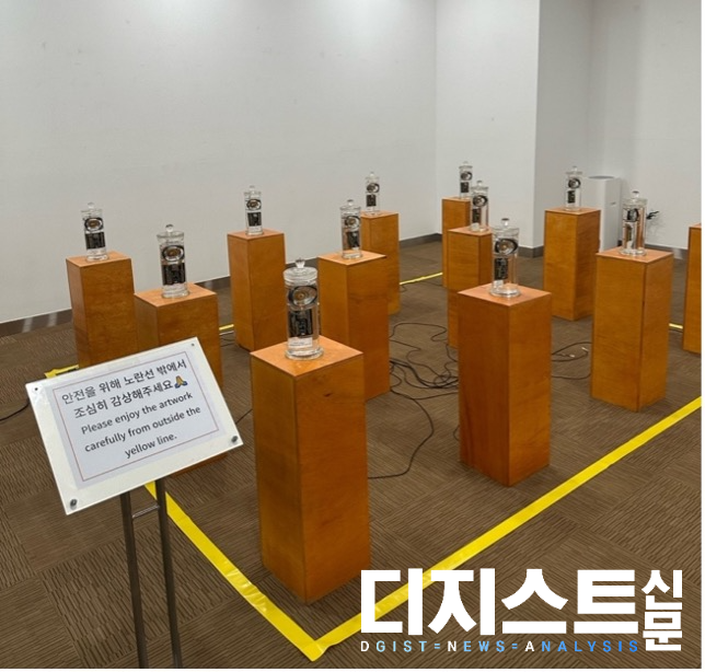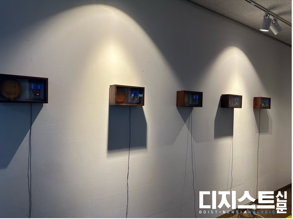 한편 이번 작품은 원예찬 작가가 직접 DGIST 갤러리에 방문해 작품 배치를 고려하였으며, 1-2일에 걸쳐 갤러리 공사를 완공했다. 전시 담당자 박민선은 ‘소리가 나는 첫 전시이다보니 학생들의 반응이 궁금했다. 인문학과 과학이 합쳐진 예술을 학생들이 즐겁게 관람했으면 좋겠다.’ 라며 개인전에 대한 학생들의 관심을 촉구했다. 본 기자는 미래세대의 시각에 몰입하며, 전시장 공간이 마치 다른 시간의 흐름을 지니는 느낌을 받았다. DGIST 구성원들도 1층 학술정보관 갤러리에 방문하여 본 기사의 내용에 공감해 보길 권한다. 현재에 종속되어 생각하지 못했던, 미래에 대한 상상력을 기를 수 있는 시간이 될 것이다.