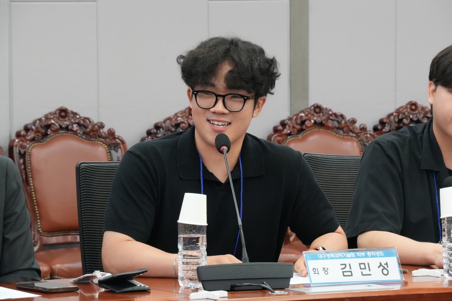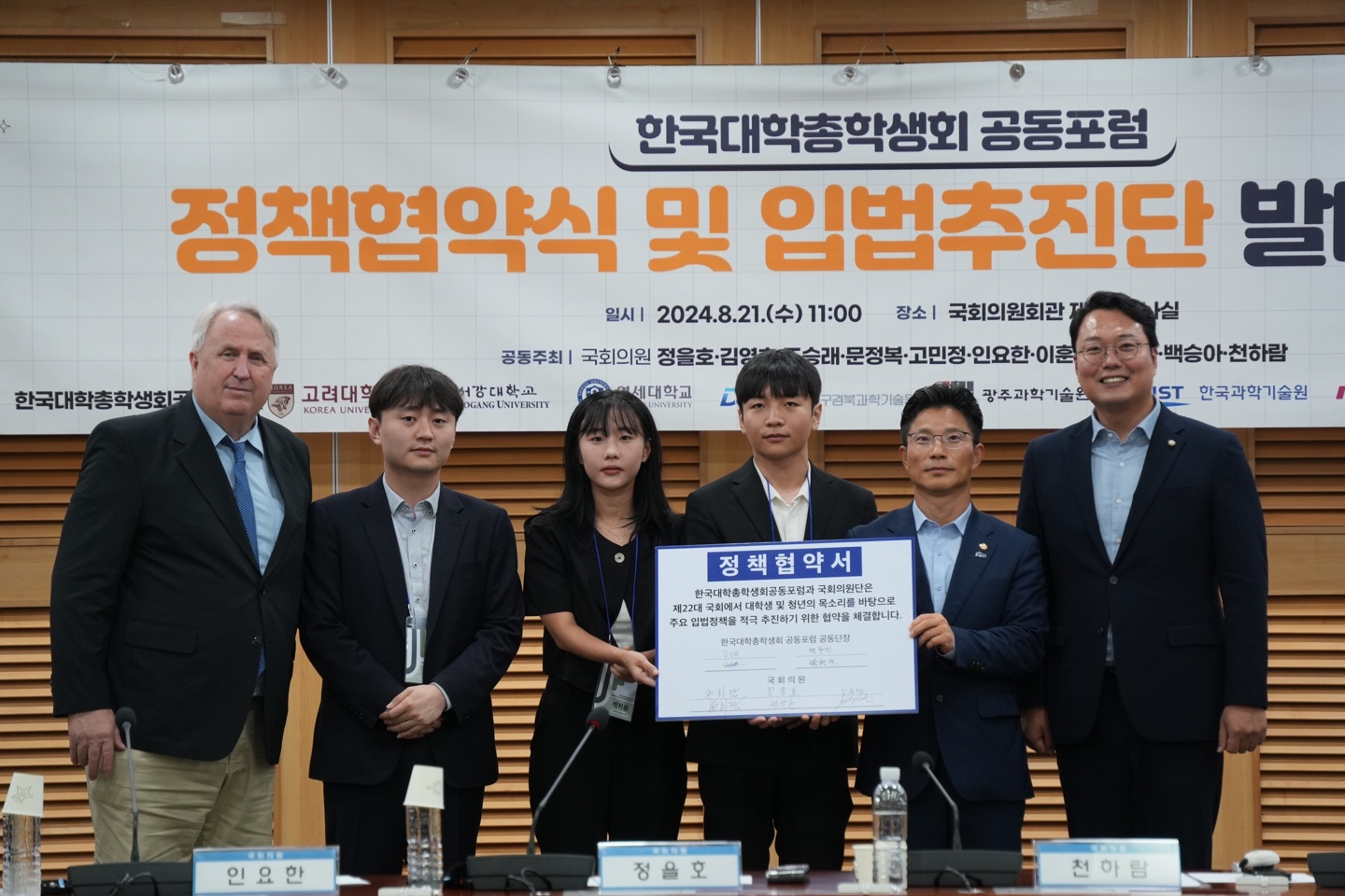 지난 21일, 한국대학총학생회 공동포럼(이하 공동포럼)이 국회 의원회관 제2세미나실에서 국회의원 정책협약식과 입법추진단 발대식을 진행하였다. 본 행사는 ▲정을호(민주) ▲백승아(민주) ▲문정복(민주) ▲인요한(국힘) ▲천하람(개혁) ▲조승래(민주) ▲이훈기(민주) ▲김영호(민주) ▲고민정(민주) 의원이 공동주최하였으며, 김민성 DGIST 학부 총학생회장(이하 김 회장)도 참석하여 모두 발언에 참여하였다.