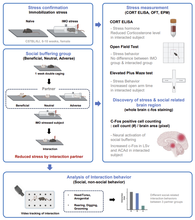 사회적 완충이 인간뿐만 아니라 쥐에서도 나타남은 선행 연구에서 알려진 사실이다. UGRP팀은 한 걸음 더 나아가, 사회적 완충 효과를 받는 쥐(이하 수혜 쥐)와 그 곁에 있는 쥐(이하 상대 쥐)가 있을 때 상대 쥐의 상태에 따라 사회적 완충 효과가 달라질 수 있는지 의문을 품었다. 연구팀은 상대 쥐가 수혜 쥐를 만나기 전에 겪은 경험에 따라 ▲긍정 그룹 ▲부정 그룹 ▲중립 그룹으로 나누어 실험했으며, 수혜 쥐의 스트레스 완화 정도를 측정했다. 추가로, 수혜 쥐의 뇌 활성 부위를 분석하여 사회적 완충에 관여하는 뇌 부위를 밝히고자 했다.