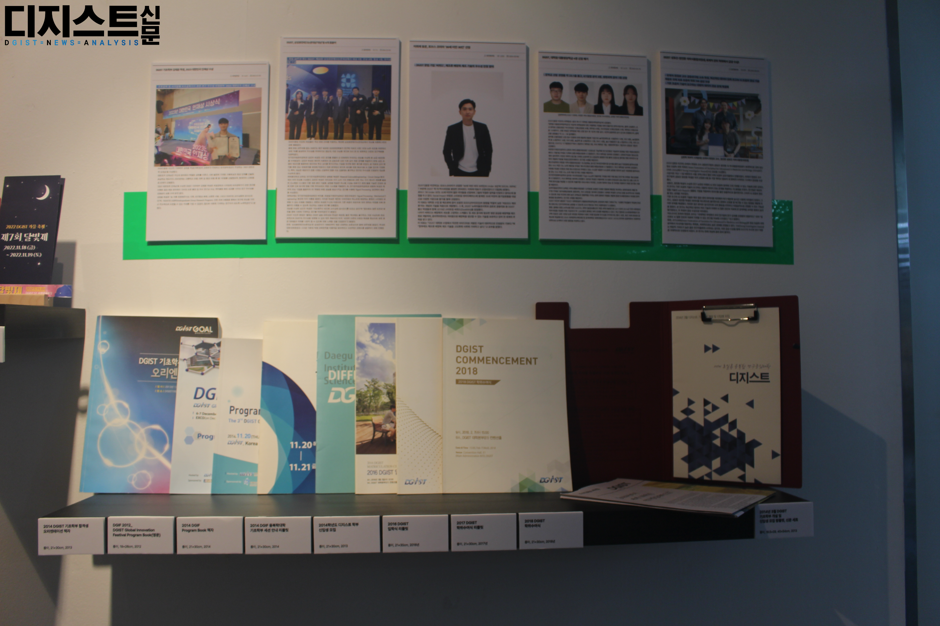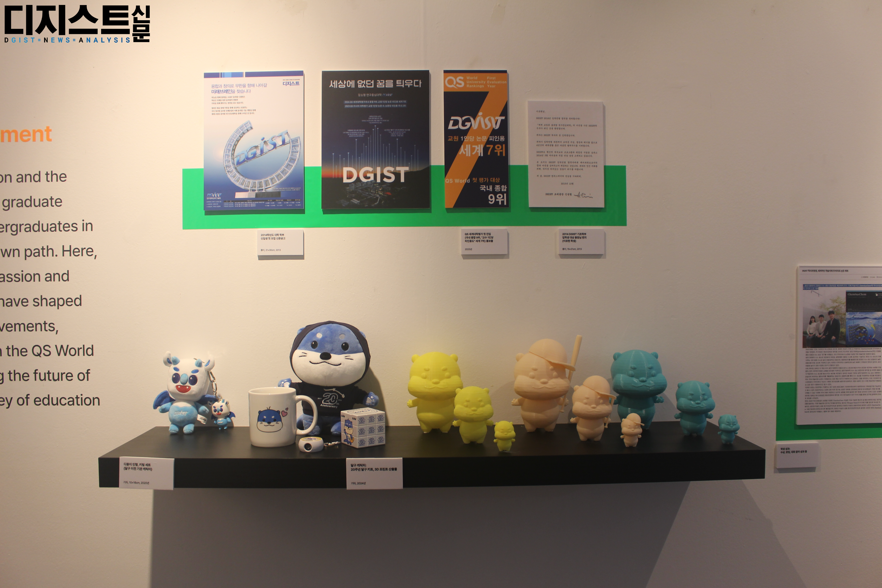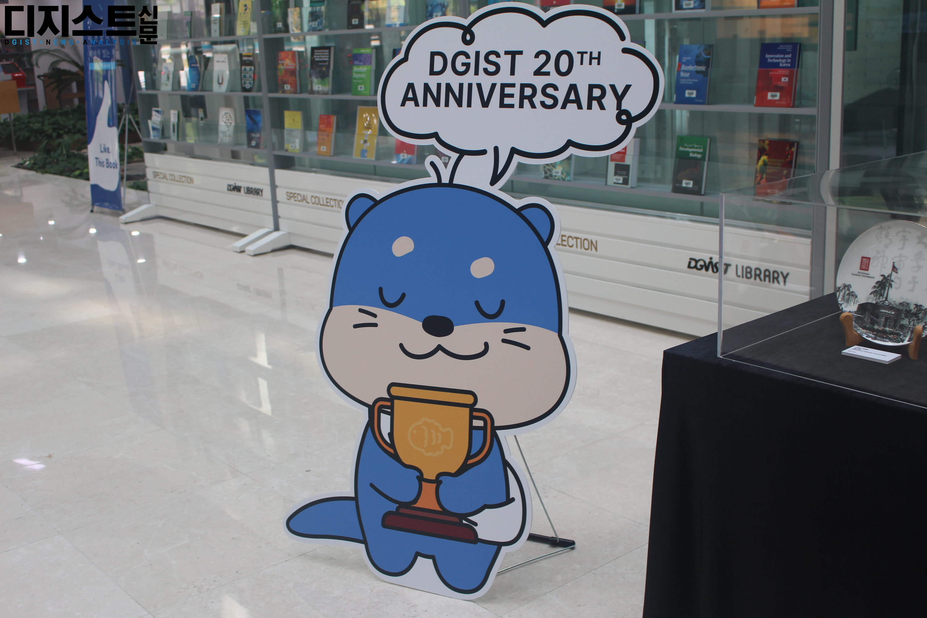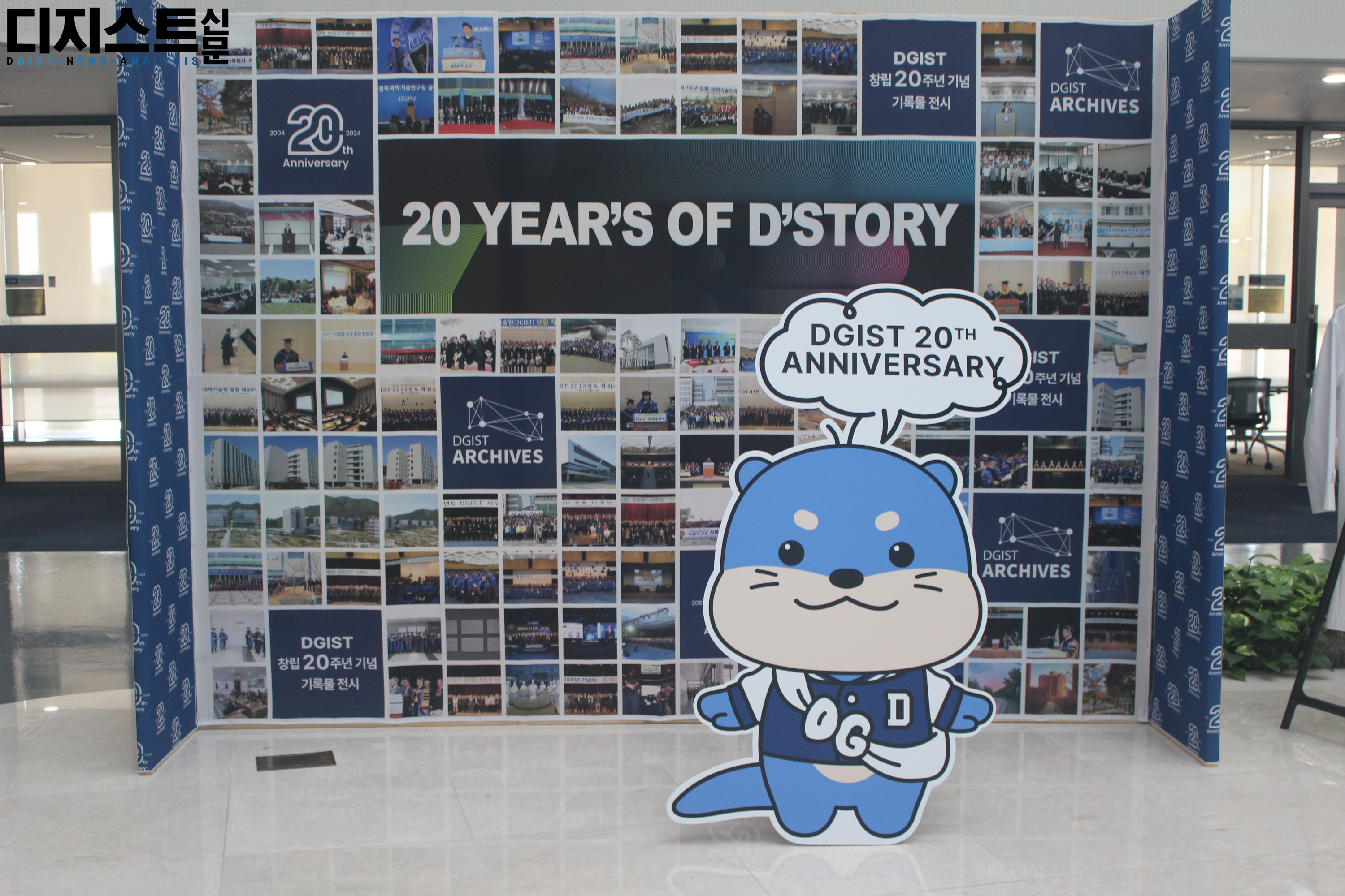 지난 9월 2일, 학술정보관(E8) 1층 로비와 갤러리에서 창립 20주년 기념 전시가 시작되었다. ▲구성원 저서 ▲총장실 보유 기록 ▲포토존 ▲직원 근무복, 학잠 체험존 ▲홍보영상, 3D 프린트 산출물 ▲초기 설립 문서 기록 ▲기관 연혁 ▲기관 상징 기록 ▲교육, 학생 기록 ▲연구성과 ▲피드백존이 마련된 모습을 디지스트신문 DNA가 담았다. 본 전시는 10월 13일까지 계속될 예정이다.