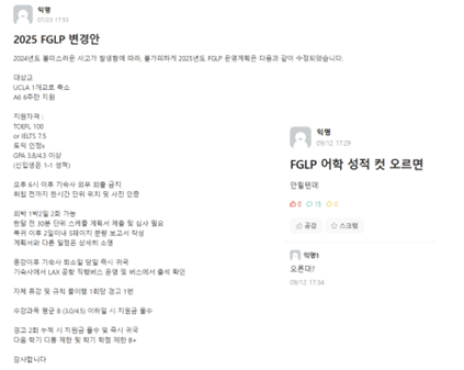 최근 학생들 사이에서 FGLP의 지원이 줄어들 것이라는 소문이 돌았다. 이번 여름 진행된 2024년도 FGLP에서 과도한 예산을 사용하여 오는 2025년도 사업에서는 예산이 줄어들 것이라는 내용이었다. ▲1인당 지원 예산 금액에 상한선을 설정해 지원 규모를 줄인다는 내용 ▲요구 어학 성적의 기준을 상향 조정해 자연스럽게 참여자 수를 줄인다는 내용 등이 주로 확인되었으며, 이 소문은 온라인 커뮤니티 에브리타임 등을 통해 유포되었다.
