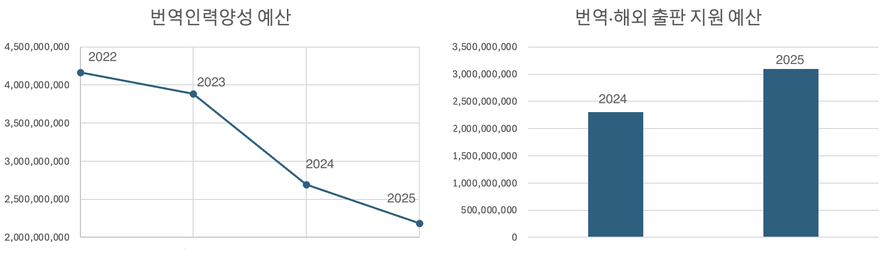 기획재정부의 정부 예산안에 따르면, 번역 인력 양성에 할당된 예산은 ▲2022년 41억 6천 6백만 원▲2023년 38억8천6백만 원 ▲2024년 26억9천1백만 원으로 매년 감소해왔으며, 2025년에는 이보다 더 줄어 21억8천8백만 원 수준이다. 물론 이번 한강의 수상의 영향으로, 2025년 번역·해외 출판 지원 예산이 23억에서 31억으로 34.5% 증액했다고는 하지만, 이는 일시적인 정책일 뿐이다. 이에 그칠 것이 아니라 번역 작업이 지원을 받을 수 있는 환경을 조성할 구체적이고 장기적인 계획이 필요하다.