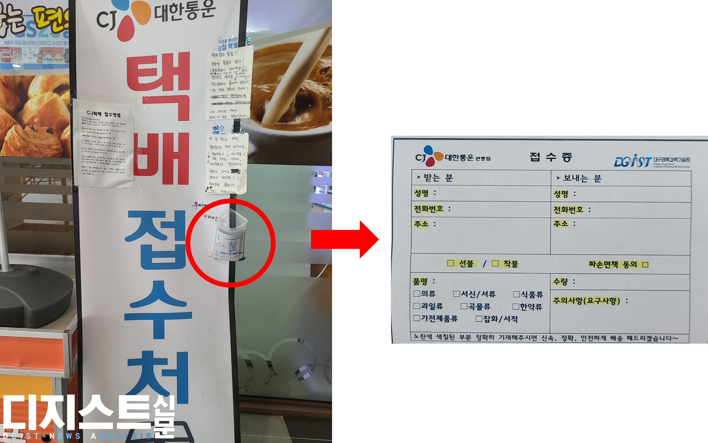 A: Absolutely not! He can send packages through CJ Logistics in the dorm. First, find the "Package Reception Desk" banner near the convenience store. Carefully read the instructions posted there, then take the required number of delivery receipts from the plastic bags attached below. Fill out the shipping details on the delivery receipt, mark it as cash-on-delivery, and attach it to the top of the package. Finally, place the package near the whiteboard in front of the security center. The address format for Biseul Village is: "Room X, Building X, Biseul Village, 333, Techno Jungang-daero, Hyeonpung-eup, Dalseong-gun, Daegu (대구광역시 달성군 현풍읍 테크노중앙대로 333 비슬빌리지 X동 X호)". For heavy items like books, divide them into manageable portions and pack them carefully. If the package exceeds 15 kg or is poorly packed, it can be refused for delivery.
