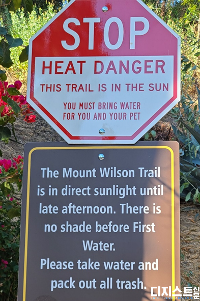 물론 튼튼한 신체만 있으면 산에 오를 수는 있지만, 안전을 위해 등산 시 충분한 물과 선크림, 신용카드, 보조배터리, 간식거리 정도는 꼭 챙기기를 추천한다. 이 중에 제일 강조하고 싶은 것은 충분한 물이다. 당시 물을 4L나 챙기면서 스스로도 과하다고 생각했었는데, 막상 등산할 때 날이 너무 더워 올라가는 동안 다 마셔버렸다. 등산로 중간에는 물을 공급받을 수 있는 곳이 없기 때문에 안일한 마음에 물을 덜 챙겼다면 아찔한 상황이 벌어질 뻔했다. 또한 등산로엔 그늘이 거의 없어 LA의 작열하는 직사광선을 등산 내내 정면으로 맞아야하고, 10시가 넘어가면 기온이 급격히 상승하기 때문에 등산을 최대한 빨리 시작하는 것을 추천한다. 현지인들은 대부분 새벽이나 해가 뜰 무렵에 산행을 시작한다고 한다. 9시에 등산을 시작했을 때는 이미 올라가는 사람보다 하산하는 사람이 더 많았을 정도이다. 그리고 우리나라 산과는 다르게 윌슨산은 정상을 제외하고 통신이 가능한 곳이 없다는 점을 유의하자. 그리고 중간에 화장실이 없으므로 등산 전 등산로 입구 근처 공원 화장실을 미리 이용하자. 그나마 다행이게도 정상에는 급수대와 화장실이 있다. 마지막으로 등산로 중간중간에는 다른 등산 코스로 빠지는 갈림길이 있기 때문에 다른 길로 새지 않게 주의해야 한다. 이정표가 제대로 표기되어 있지 않은 경우가 많아 잘 모르겠다면 부끄러워하지 말고 지나가는 등산객에게 도움을 요청하자.