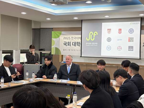 지난 1일 한국대학총학생회 공동포럼(이하 공동포럼)이 연세대학교 학생회관에서 인요한 의원(이하 인 의원) 과 함께 ‘국민의힘 정책 전달식’을 진행했다. 이번 행사는 지난해 8월 출범한 공동포럼 내 국회 대학생 입법추진단(이하 입법추진단)이 그간 연구하여 작성한 정책 제안서를 인 의원에게 전달하는 것으로 시작했으며, 해당 법안들의 취지와 내용에 관해 설명하고, 30분가량 간담회를 이어갔다 . 이번 행사에서 입법추진단이 전달한 정책 제안서는 이민재 DGIST 총학생회장(`23)을 비롯해 ▲연세대 ▲KAIST 등 공동포럼 운영위원교의 총학생회장단이 작성하고 의결하였다.