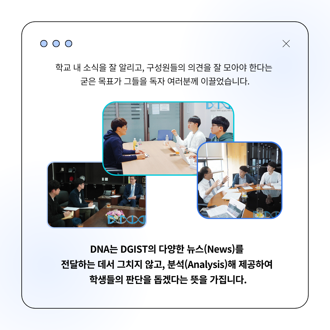 DNA는 DGIST의 다양한 뉴스(News)를 전달하는 데서 그치지 않고, 분석(Analysis)해 제공하여 학생들의 판단을 돕겠다는 뜻을 가집니다. 디지스트신문 DNA 기자 일동은 선배들에게 물려받은 ‘DNA’라는 자랑스러운 이름과 그 목표에 걸맞게 독자 여러분께 다가가겠습니다.
