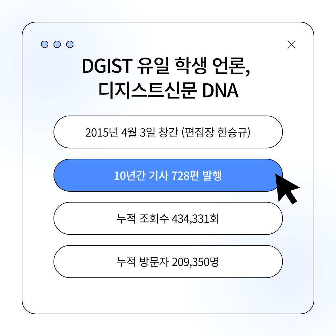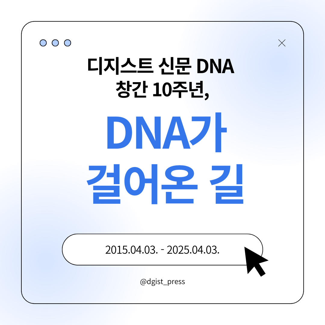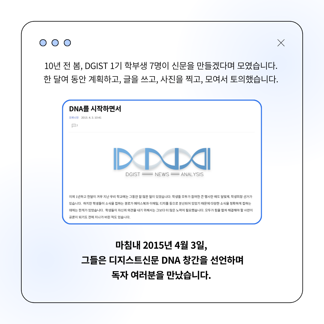10년 전 봄, DGIST 1기 학부생 7명이 신문을 만들겠다며 모였습니다. 한 달여 동안 계획하고, 글을 쓰고, 사진을 찍고, 모여서 토의했습니다. 마침내 2015년 4월 3일, 그들은 디지스트신문 DNA 창간을 선언하며 독자 여러분을 만났습니다. 학교 내 소식을 잘 알리고, 구성원들의 의견을 잘 모아야 한다는 굳은 목표가 그들을 독자 여러분께 이끌었습니다.