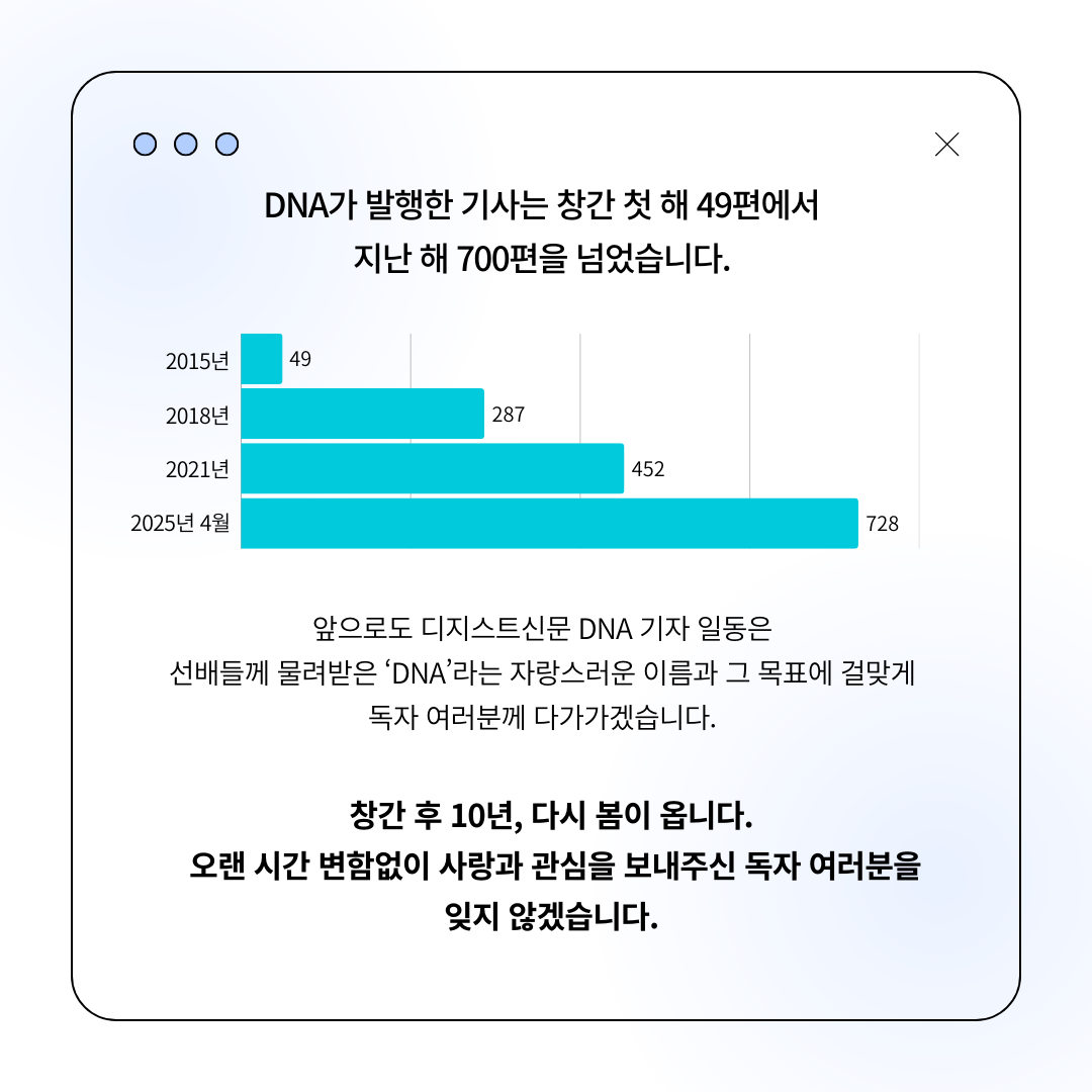 창간 후 10년, 다시 봄이 옵니다. 오랜 시간 변함없이 사랑과 관심을 보내주신 독자 여러분을 잊지 않겠습니다. 디지스트신문 DNA는 오늘도, 다시 여러분을 보며 펜을 들겠습니다.