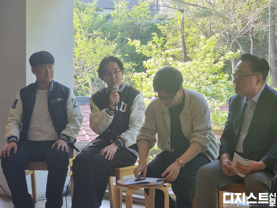 연설을 마친 후 한 후보는 고동진 국민의 힘 의원(이하 고 의원)과 함께 각 대학 총학생회 대표자 및 현장 참석 대학생들과 대화하는 시간을 가졌다. 이민재 DGIST 총학생회장(`23, 이하 이 회장)은 임성근 UNIST 총학생회장('20, 이하 임 회장)과 함께 R&D 및 연구자 지원 분야에서 꾸준한 투자가 필요하다고 주장했다. 더불어, 단기적인 투자는 보여주기식 투자에서 그칠 우려가 있다며 해결 방안을 물었다.