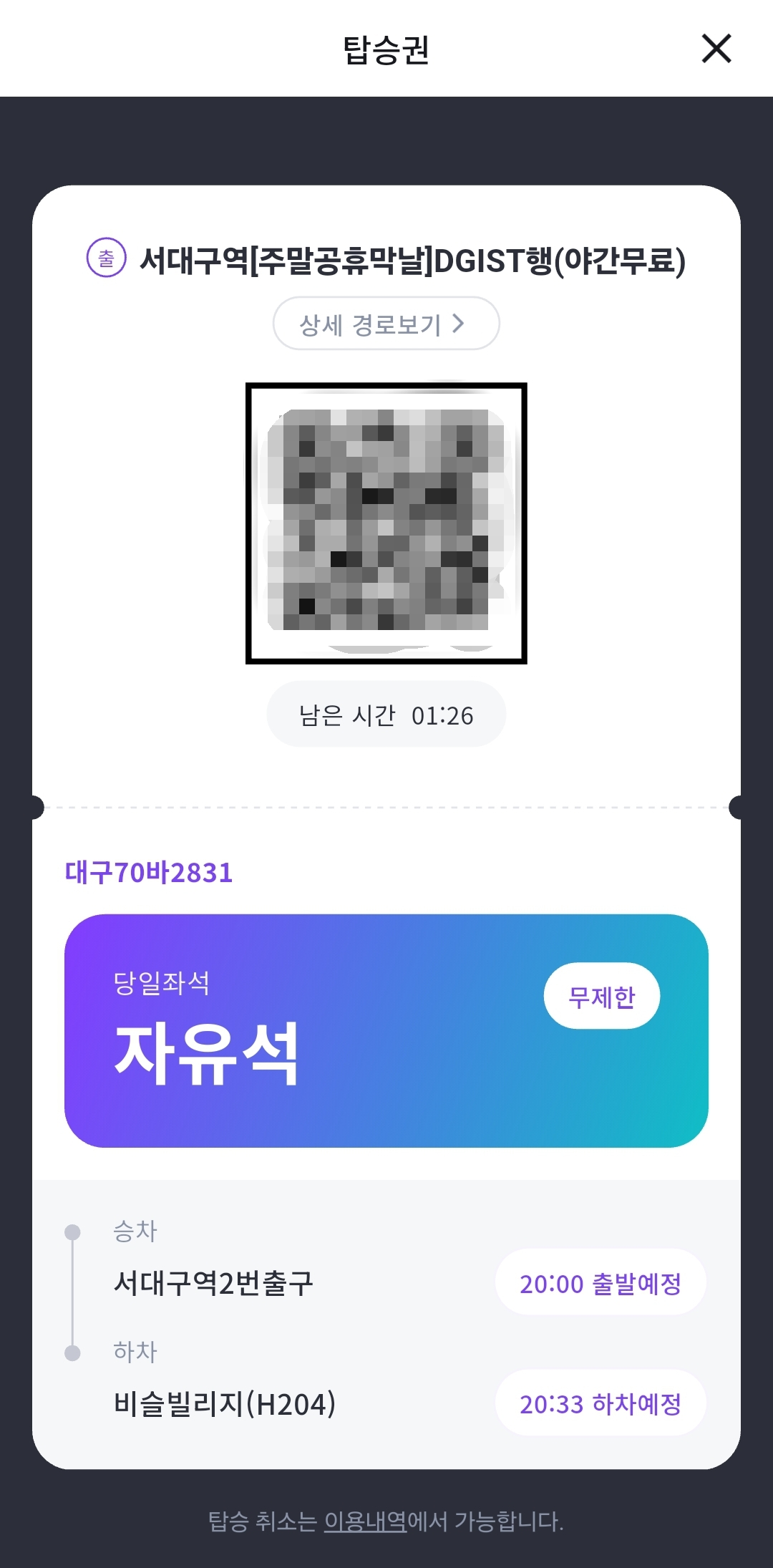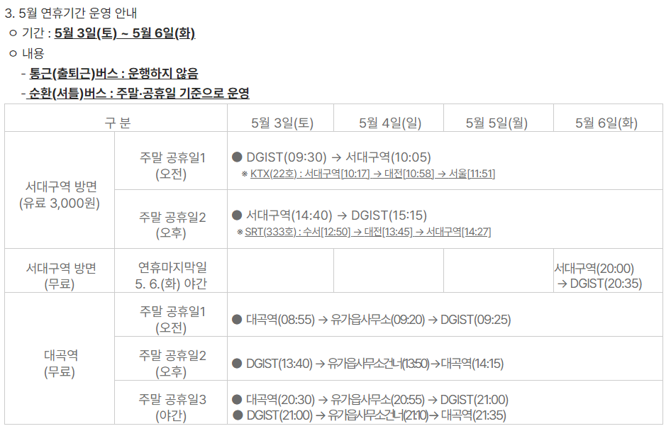 다가오는 5월 3일(토)부터 6일(화) 연휴기간 동안 통근버스는 운행되지 않으며, 순환셔틀버스만 주말·공휴일 기준 노선으로 일부 운행된다. 이 중 서대구역 방면은 일부 구간이 유료이며, 유료 노선 이용 시, 앱을 통한 카드 결제 후 QR 탑승권 발급이 필수로 결제 오류나 탑승권 미발행으로 인해 탑승 제한이 발생할 수 있어 각별한 주의가 필요하다.
