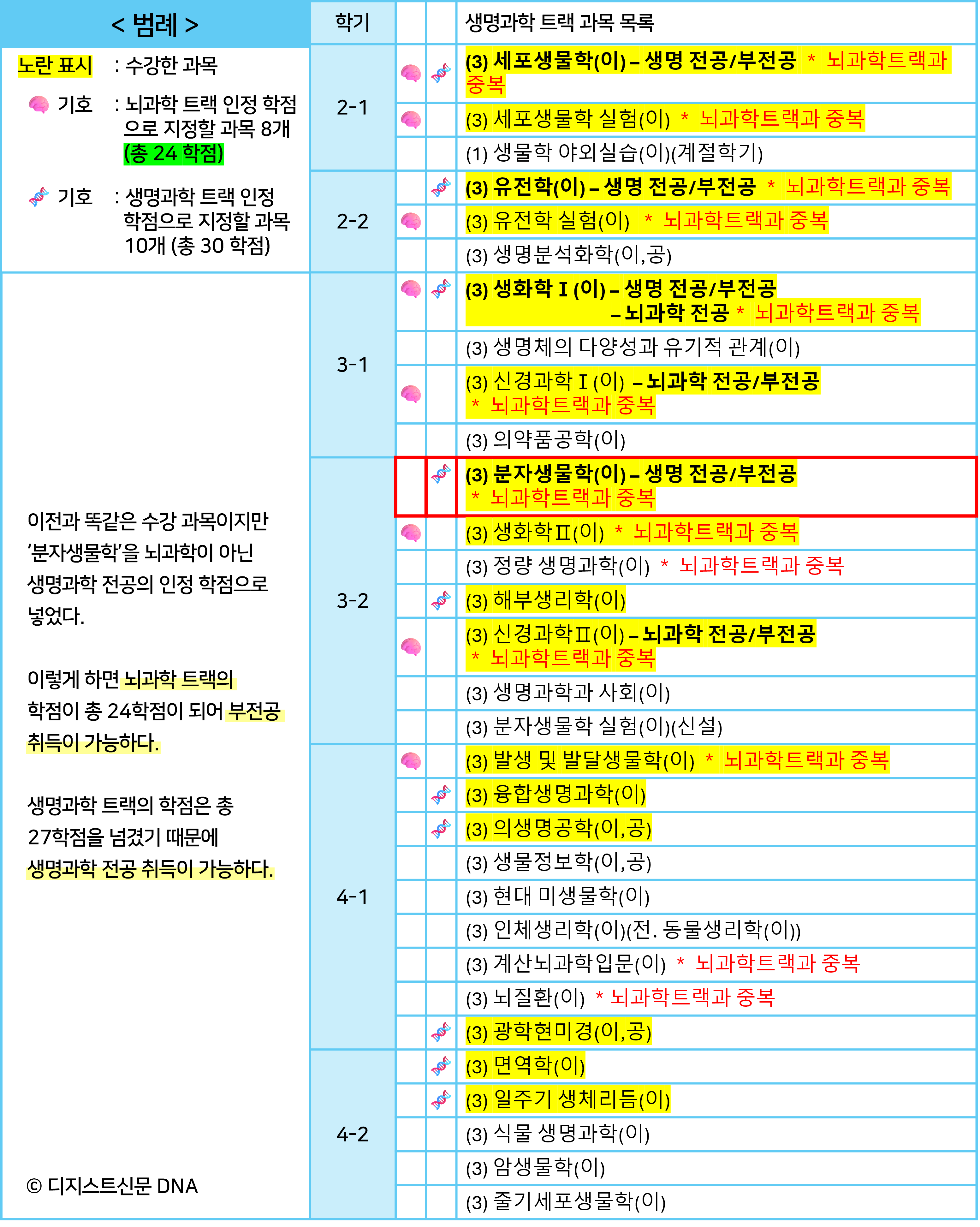 생명과학과 뇌과학을 복수 전공, 혹은 한쪽을 부전공하고 싶다면 ▲전공/부전공 최소 학점 ▲중복 학점 인정 과목 ▲각 전공의 필수 과목 등을 잘 고려해야 한다. 전공 트랙은 최소 27학점 이상, 부전공은 18학점 이상을 이수해야 한다. 중복 학점은 3학점 과목 기준 2개 과목만 지정할 수 있으므로 전략적으로 선택해야 한다. 마지막으로 제일 간과하기 쉬운 기준이 있다. 전공 필수 과목은 해당 트랙의 인정 학점으로 지정되어야만 전공 인정이 가능하다.