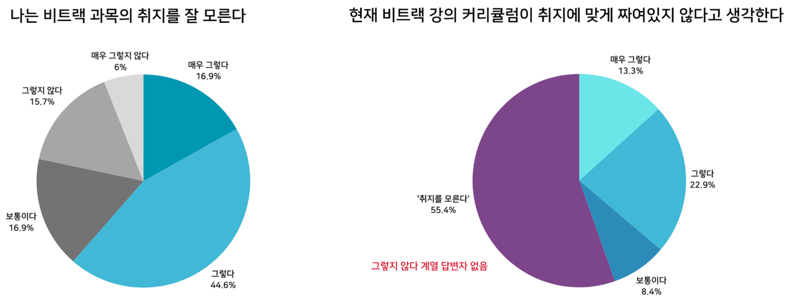 설문 응답자의 절반 이상이 비트랙 교과목의 취지를 잘 모른다고 답했으며, 취지를 알고 있다고 답한 나머지 절반 가까이도 대부분 비트랙 교과목이 취지에 맞게 구성되어 있지 않았다고 응답했다. 즉, 응답자의 10명 중 9명은 비트랙 교육에 대한 공감대를 형성하지 못하고 있는 것이 비트랙 교육의 현주소이다.