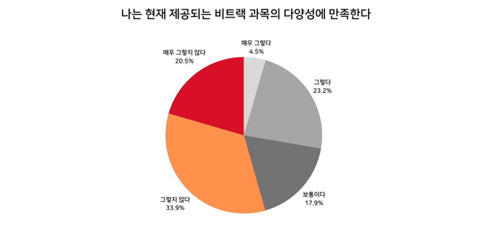 이에 학교 행정 측에서도 비트랙 교과목 수가 부족하다는 점을 인지하고 지난 몇 년간 새로운 강의를 일부 추가했으나, 몇몇 특정 분야에 국한되었기 때문에 기존 비트랙 강의가 가진 다양성 문제를 해결하기에는 역부족이었다. 실제 설문조사에서도 비트랙 교과목의 다양성이 부족하다는 응답이 과반수를 차지하며 학부생들의 불만을 반영했다. 비트랙 과목 개설 방향에 대한 설문 조사 결과, 응답자의 대다수는 관련 트랙 간 융합 강의 또는 트랙과 교양이 결합된 강의 개설을 희망하는 것으로 나타났다. 또한 수요에 맞는 비트랙 강의 개설을 원하는 목소리가 컸다. 특히 프로젝트성 강의 개설을 원하는 답변이 많았는데, 이는 보통 비트랙을 수강하는 대상이 고학년인 만큼 실질적인 진로 설계를 위해 보다 유용한 교육 과정을 원하고 있음을 보여준다.