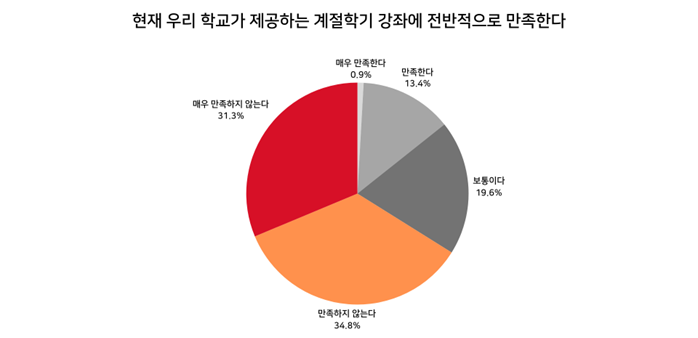 타 대학의 계절학기는 학기 중 현실적인 이유로 개설이 어려웠던 과목이나 수요가 높은 강의를 제공함으로써 학생들에게 추가적인 학습 기회를 제공하는 데 큰 의미가 있다. 그러나 현재 DGIST 학부에서 제공하는 계절학기 강의는 거의 전무한 수준이다. 2024년 겨울학기 기준, 학부생을 위한 계절학기 강의는 Scientific Writing 단 한 과목 뿐이었다. 이에 대한 설문조사에서도 학생들의 높은 불만이 확인됐다. 응답자의 약 66%가 계절학기에 대해 불만족을 표했으며, 그 이유로 개설 과목 수의 절대적인 부족과 수강 수요를 반영하지 못하는 현실을 지적했다. 사실 이러한 지적은 과거부터 꾸준히 제기되었는데, ‘타 대학 계절학기 학점교류를 신청하면 되지, 강의가 열리지도 않는 DGIST에 계절학기까지 남아있으려고 하냐’라는 학생들의 자조 섞인 한탄이 나올 정도로 개선의 여지가 보이지 않는 것이 현실이다.