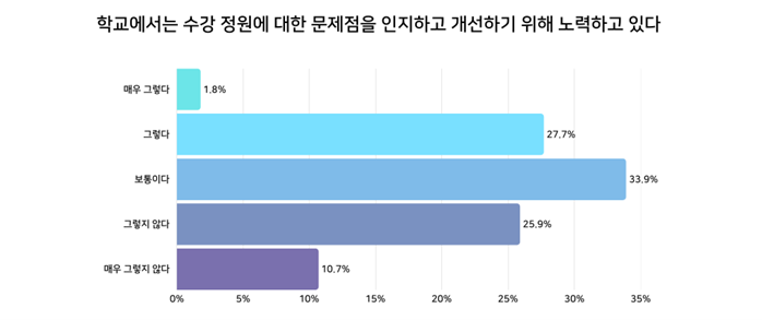 설문조사 결과, 수강 정원 문제를 해결하고자 하는 학교 당국의 노력에 대해 학부생들의 의견은 반반으로 나뉘었다. 그러나 ‘매우 노력하고 있다’는 응답보다 ‘매우 노력하고 있지 않다’는 응답이 훨씬 많았다는 점을 주목해야 한다. 이는 학교의 개선 노력에 불만족하는 집단이 만족하는 집단에 비해 그 입장이 더욱 확고하다는 것을 보여준다. 학생들은 ‘회로 이론과 계측법’과 ‘창의 기계 설계’ 등 전공 인정을 위한 필수 과목들이 타 강의와 상당수 겹치는 문제가 지속되는 것에 대해 불만을 넘어 ‘문제 제기를 해도 개선이 되지 않을 것’이라는 회의감까지 느끼고 있는 것으로 보인다. 그 회의감의 원인에는 특정 전공의 동일 학년 과목이 서로 겹치는, 강의 시간 배정 과정에서 조금만 신경 쓰면 해결될 수 있는 문제조차 지속적으로 재발하고 있다는 점이다. 단편적인 예시가 이번 학기 컴퓨터공학 트랙의 4학년 전공 과목인 ‘강화학습’과 ‘컴퓨터비전개론’이 동일한 시간대에 배정된 사례이다. 또한 연관성이 높은 전공 사이의 필수 강의가 겹쳐 복수전공을 하기 위해 초과학기가 불가피한 문제에 대해서도 불만을 가지는 경우가 있었다. 같은 전공 내 동일 학년을 대상으로 개설된 과목이나 필수 지정 과목이 서로 겹치는 문제는 사소해 보일 수 있지만, 사실 졸업과 진로에 직접적인 영향을 미치는 중요한 문제인 만큼 이러한 문제가 해결될 기미가 보이지 않는 현실이 학생들의 강한 부정적 응답으로 이어진 것으로 보인다.