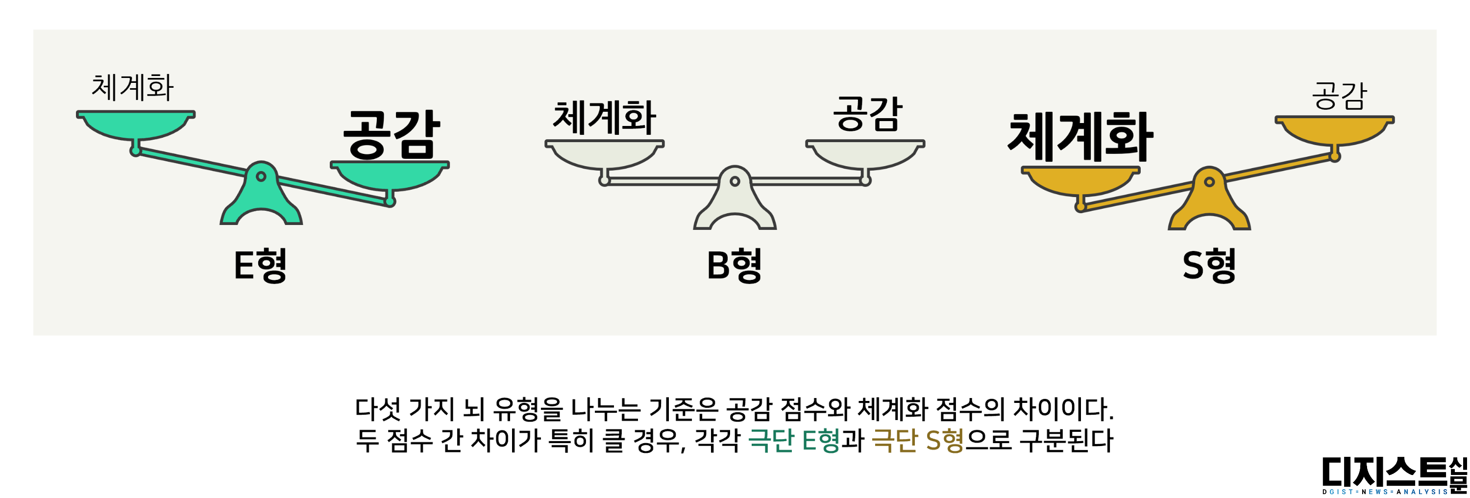 다섯 가지 뇌 유형을 나누는 기준은 공감 점수와 체계화 점수의 차이이다. 공감 점수가 체계화 점수보다 높은 사람은 E형(Empathizing), 반대로 체계화 점수가 더 높은 사람은 S형(Systemizing)으로 분류된다. 두 점수 간 차이가 특히 클 경우, 각각 극단 E형(extreme E)과 극단 S형(extreme S)으로 구분된다. 한편, 두 점수가 비슷한 경우는 B형(Balanced)으로 분류된다.[ii]