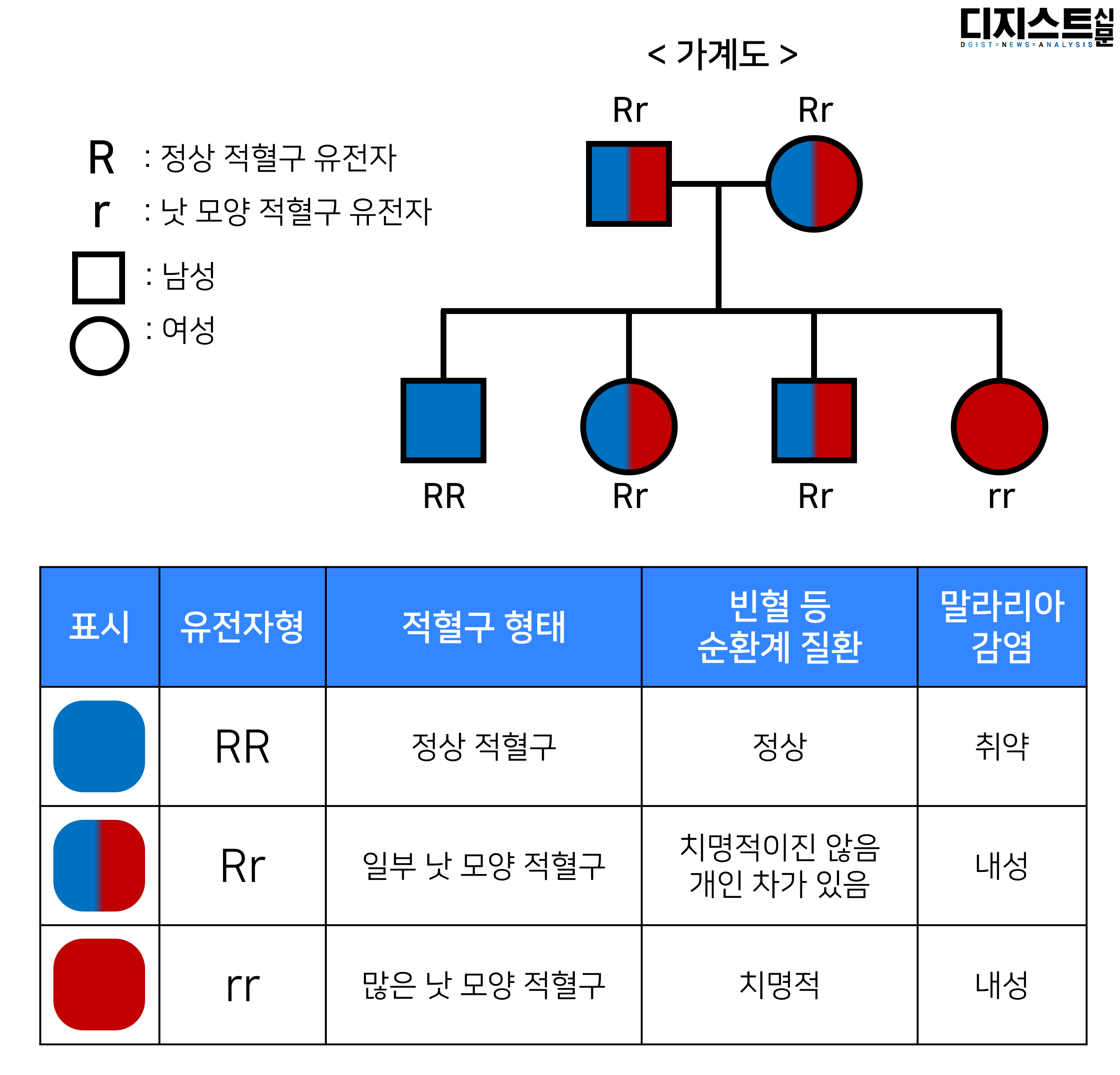 그 이유는 간단하다. 정상 유전자 하나와 낫 모양 적혈구 유전자 하나를 함께 가진 사람은 빈혈로 심하게 고생하지 않으면서도 말라리아 감염에 저항력을 갖는다. 말라리아가 창궐하는 지역에서는 말라리아로 죽을 위험이 크기 때문에, 낫 모양 적혈구 유전자의 보호를 받는 편이 생존에 더 유리한 것이다.
