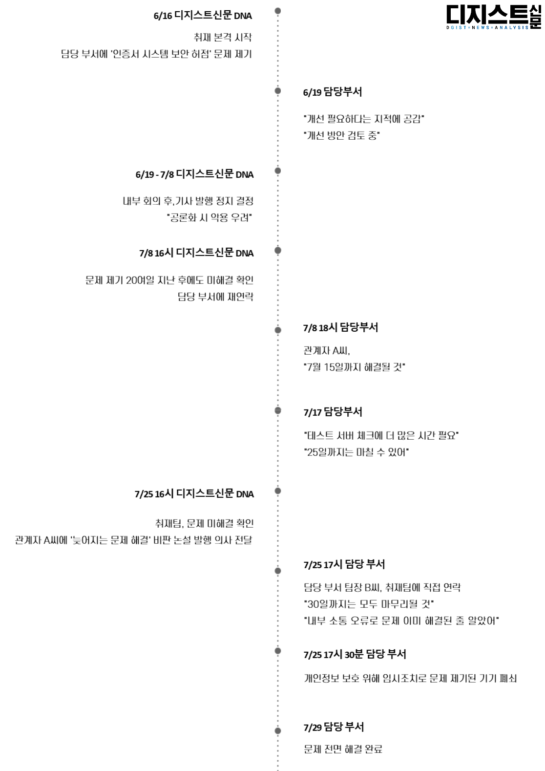 다만, 담당 부서의 늦은 대응은 유감이다. 인증서 발급 시스템을 담당하는 원내 부서는 지난 6월 ‘디지스트신문 DNA’가 취재를 시작하며 문제를 제기했을 때 이를 인식했으나 즉각적인 조치는 없었다. 문제 제기부터 해결까지 44일이 걸렸다.