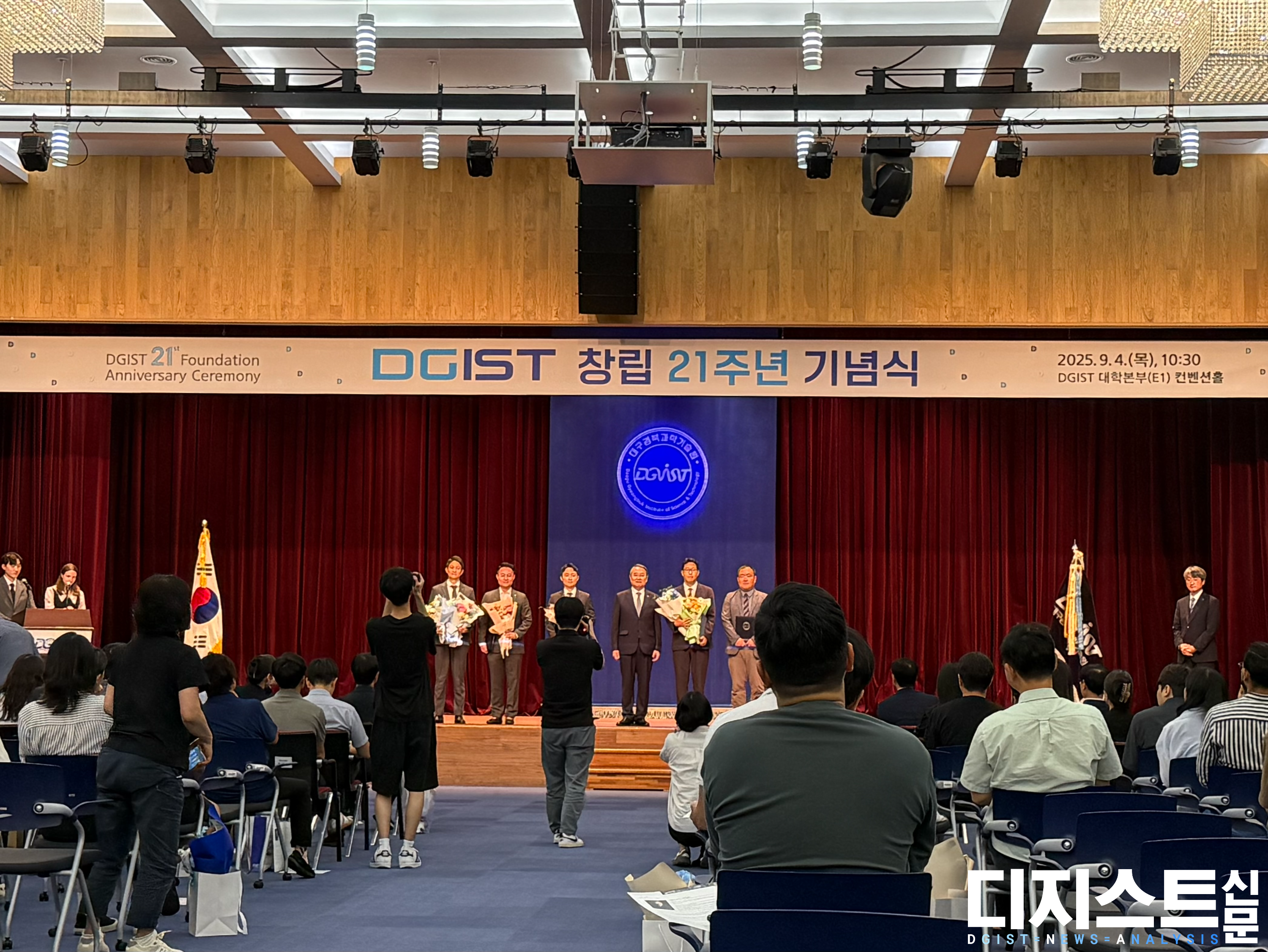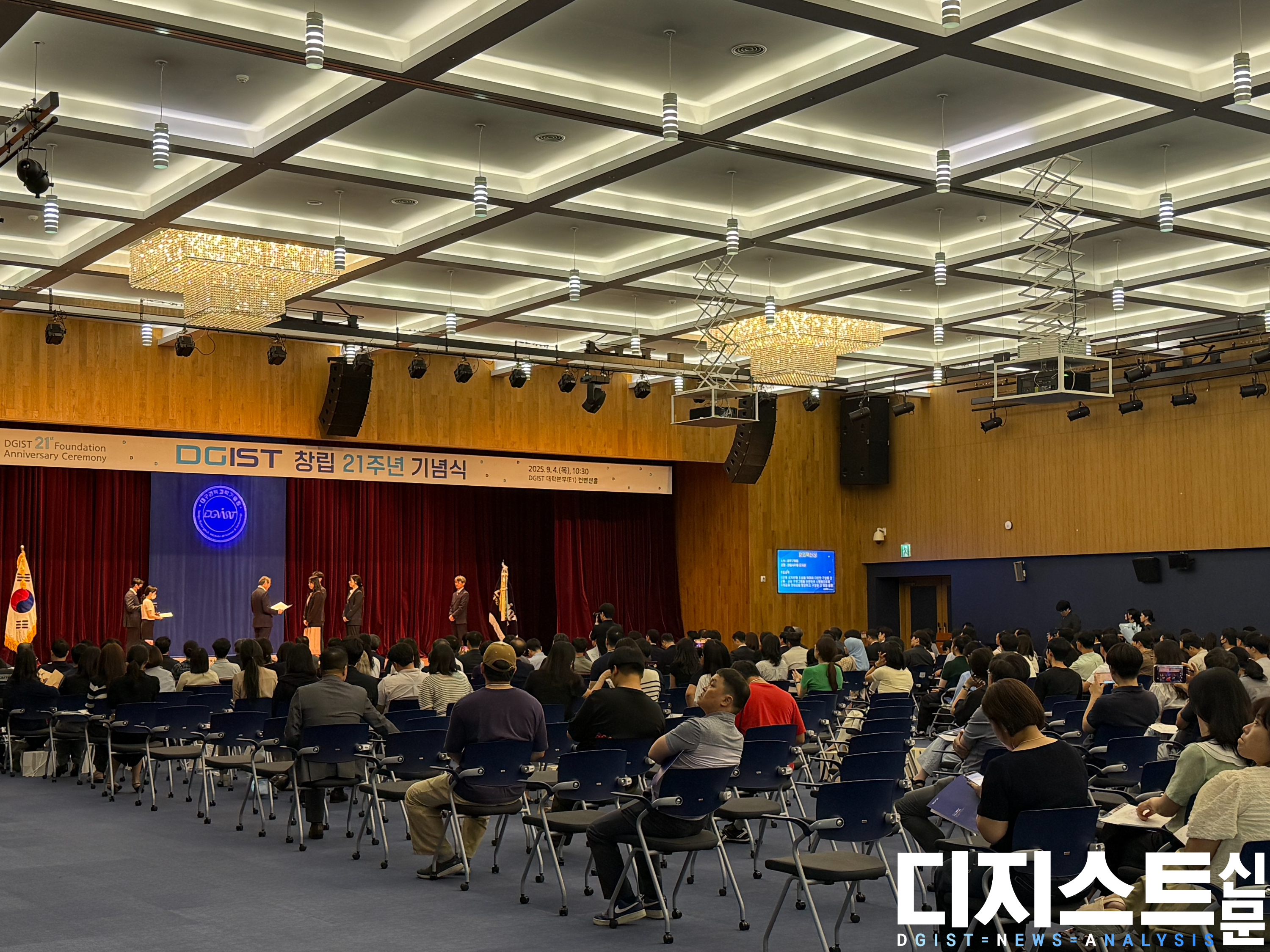 금일(4일) DGIST가 창립 21주년 기념식을 개최했다. 대학본부 컨벤션홀에서 열린 이번 행사는 ▲이사장 환영사 ▲축사(황외진 대구 MBC 사장) ▲경영 설명 ▲기념 영상 ▲감사패·포상 수여 ▲총장 기념사 순으로 진행됐다.