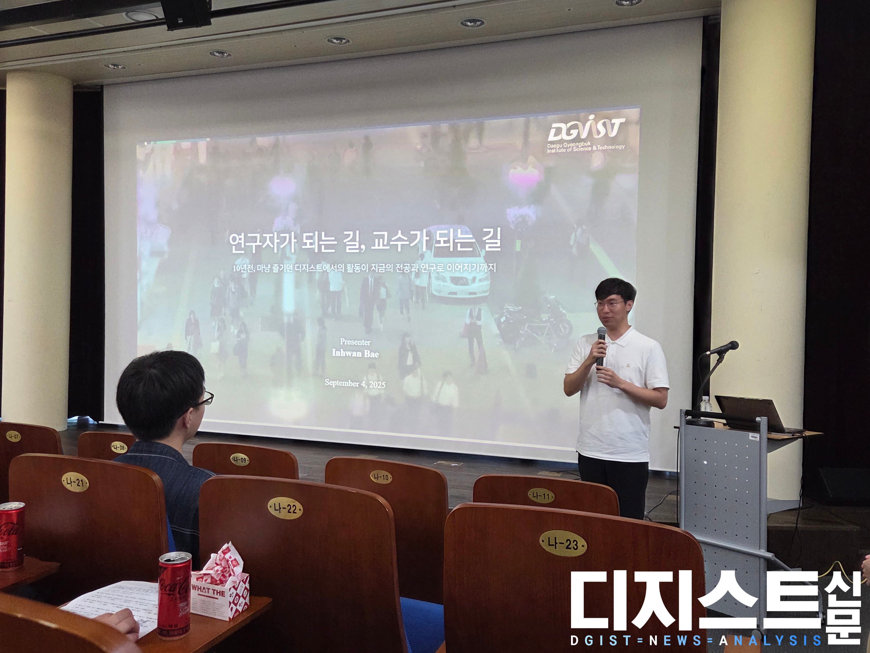지난 4일 ‘자대 1호 교수’ 배인환 박사(이하 배 박사, 관련 기사: [DGIST 사람들] 학부생에서 교수로, 첫 자대 출신 교수 배인환 동문)의 세미나가 학술정보관 312호에서 진행됐다. 이번 세미나에서 DGIST 기초학부 16학번 출신인 배 박사는 ‘10년 전, 마냥 즐기던 디지스트에서의 활동이 지금의 전공과 연구로 이어지기까지’라는 주제로 학부생을 직접 만나 기초학부 선배로서 진솔한 조언을 건넸다.