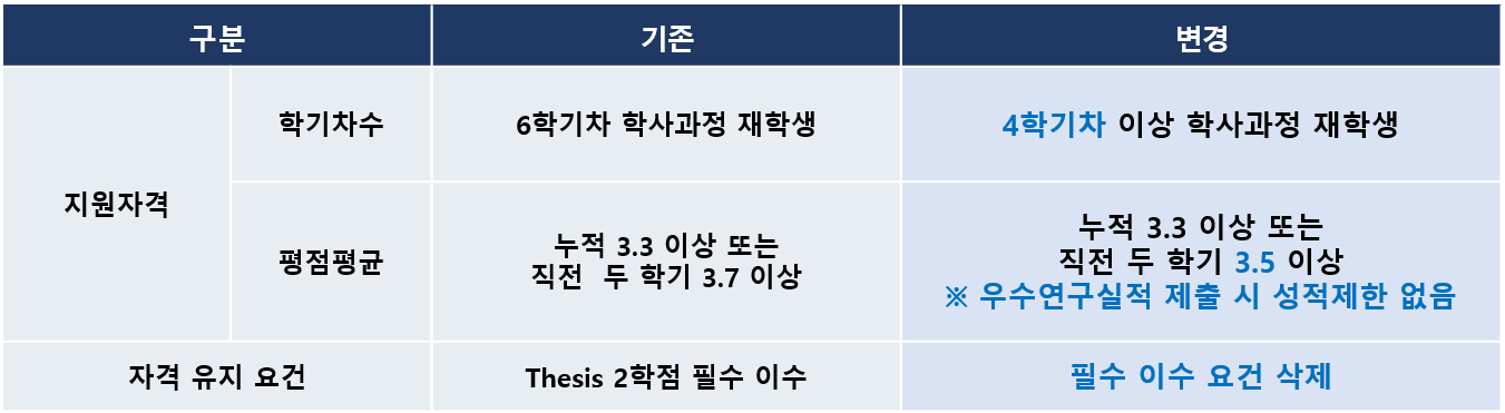 학업 성적 기준 미달해도 우수연구실적 제출 시 지원 가능