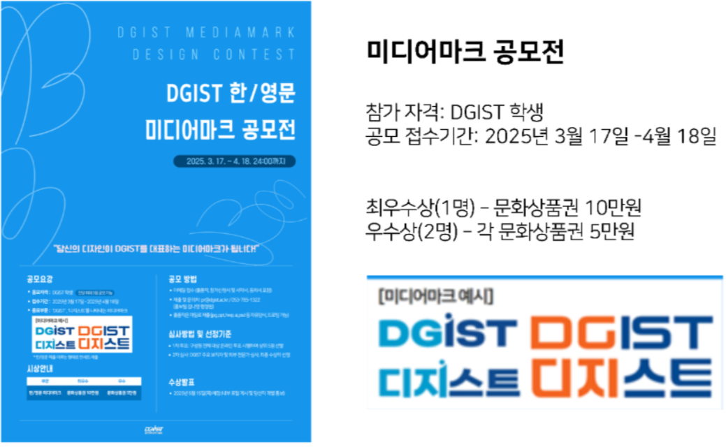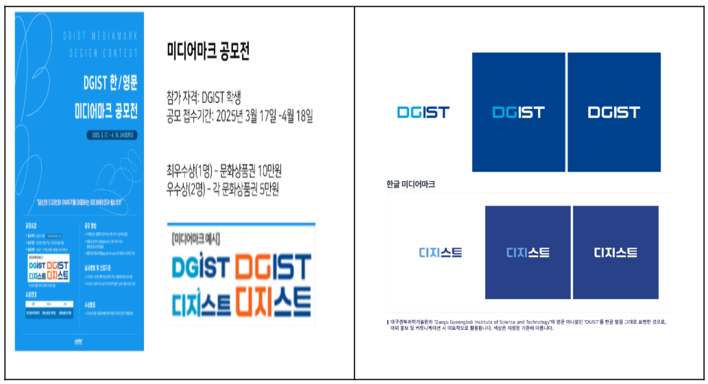 선정 과정도 의문이 많다. 지난 3월 학생포털에 올라온 ‘DGIST 한영문 미디어마크 공모전 개최’ 포스터 사진이다. 강조 표시한 부분을 보면 선정된 미디어 마크와 색깔만 다른 롯데리아 리아체 기반 로고가 보인다. 미디어 마크를 만들기 위한 공모전 포스터에 어떻게 현재 도입된 미디어 마크가 예시로 들어 있을까?