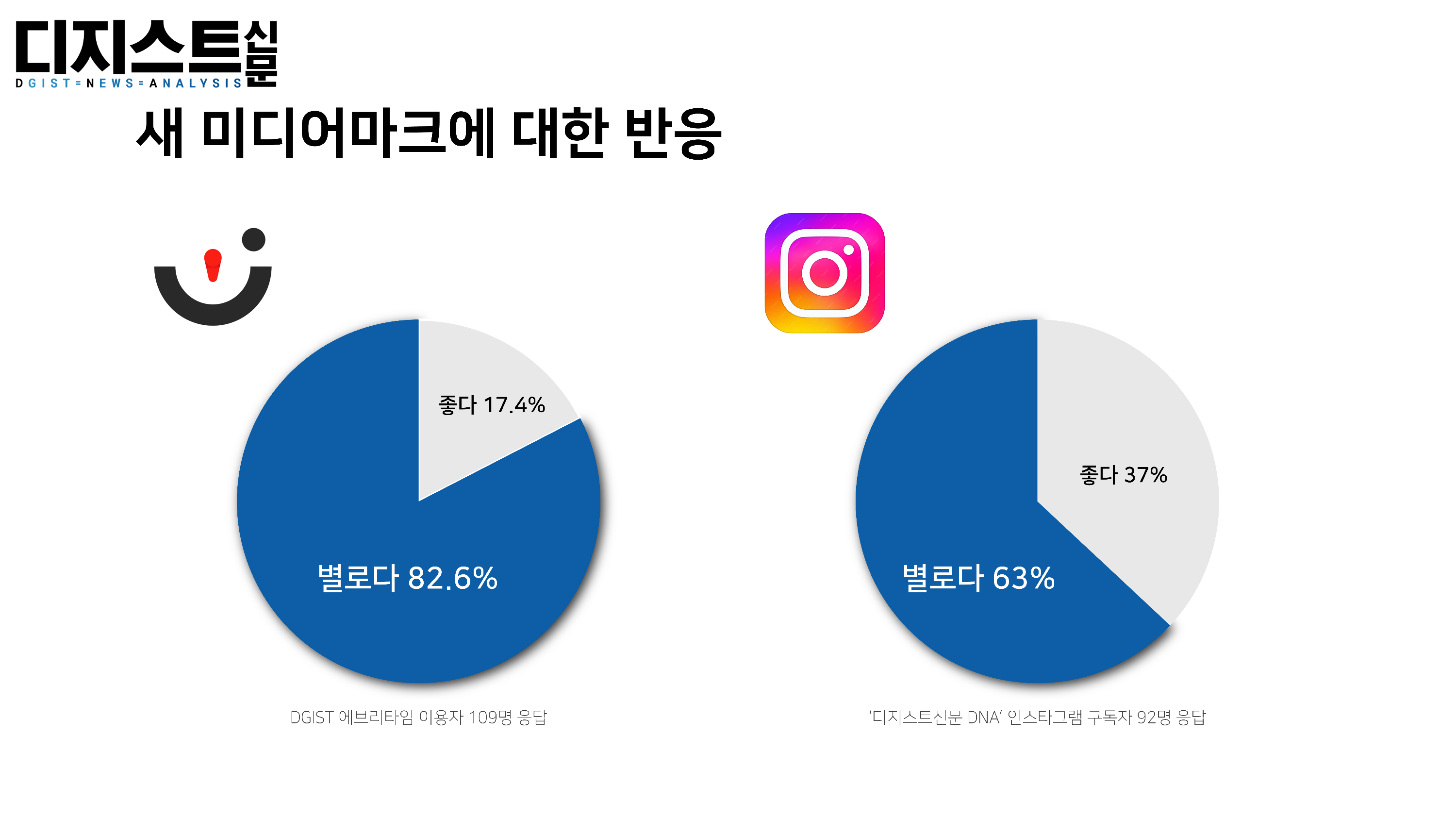 ‘디지스트신문 DNA’는 지난 5월 27일, 원내 구성원 온라인 커뮤니티 에브리타임과 디지스트신문 DNA 공식 SNS 계정(이하 SNS)을 통해 미디어 마크에 대한 구성원의 의견을 물었다. ‘기존 로고와 비교할 때, 새로운 미디어마크에 대해 어떻게 생각하나요?’ 라는 질문에 ‘좋다’, ‘별로다’ 두 선지로 응답을 받았다.