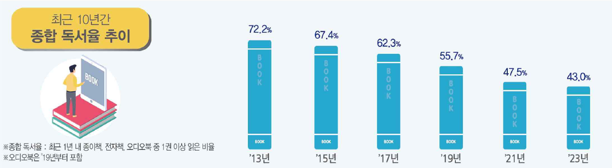 최근 10년간 독서율 추이에 대한 통계에 따르면, 성인의 독서율이 점점 줄어들어 결국 절반 이상이 1년에 책을 한 권도 읽지 않는다. 특히 충격적인 건 2021년과 2023년도 통계이다. 코로나19로 외부 활동이 줄어 독서율이 오를 법했으나, 실제 통계는 그칠 줄 모르고 하락했다.