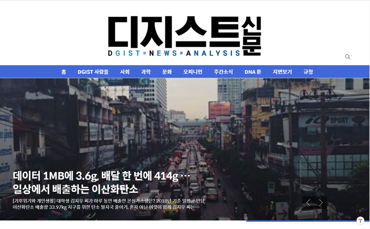 스킨변경과 함께 메인화면 구성 개편과 카테고리 개편도 진행됩니다. 기존 캠퍼스 카테고리가 사라지고 인터뷰 등 기사는 DGIST 사람들 카테고리로 분리되며 나머지 기사는 기사에 따라 어울리는 다른 카테고리로 옮겨집니다.