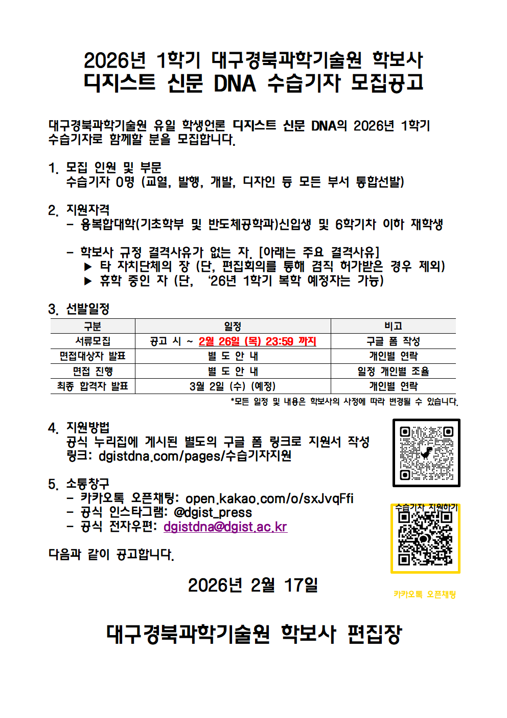 | - 오픈채팅: https://open.kakao.com/o/sxJvqFfi - 공식 인스타그램 DM: @dgist_press - 공식 전자우편: dgistdna@dgist.ac.kr |